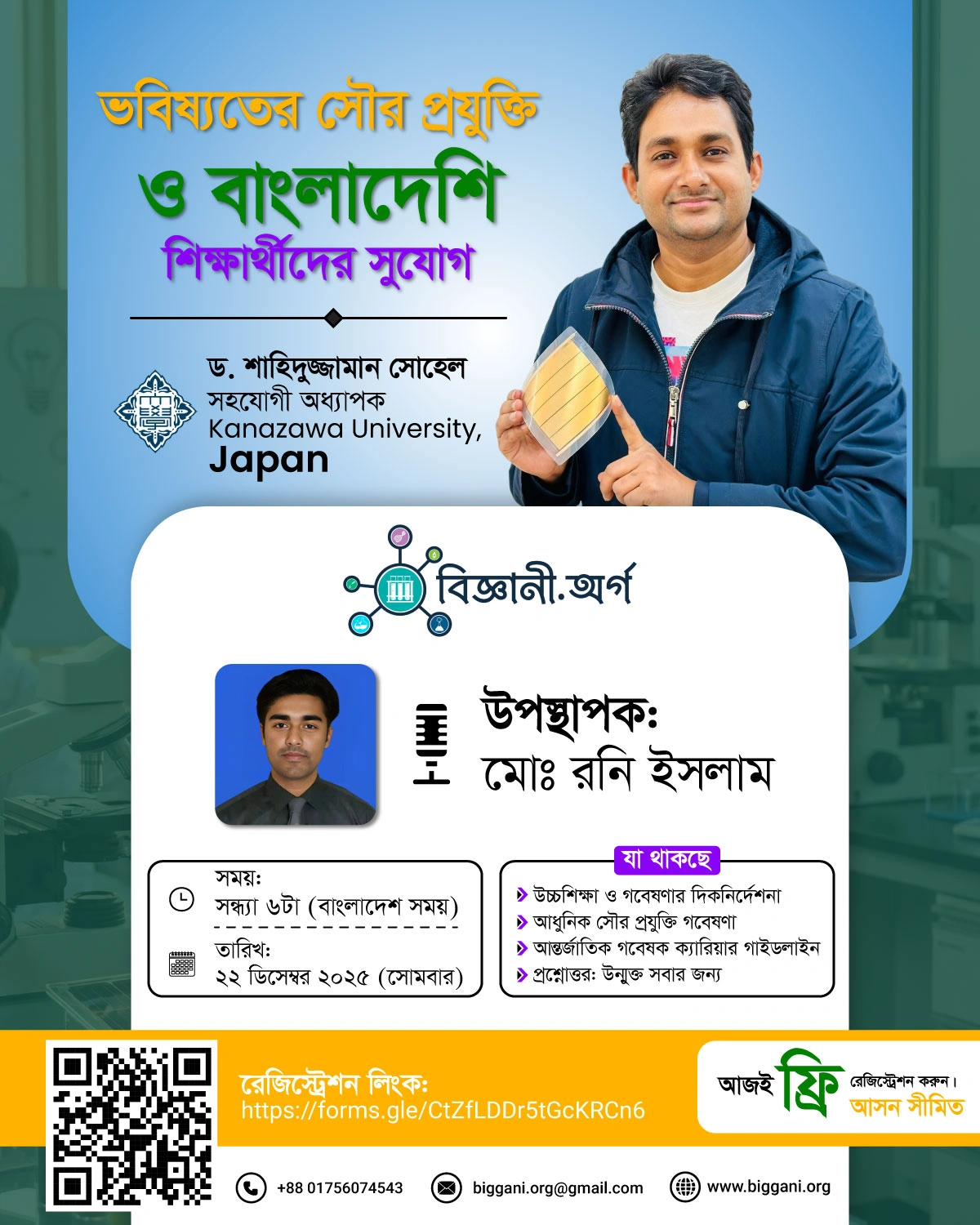 For young science enthusiasts, research-minded students, and those interested in higher education in Bangladesh, biggani.org is organizing a special online interview and seminar featuring one of the world’s leading solar technology researchers — Associate Professor Dr. Shahiduzzaman Sohel from Kanazawa University, Japan. His outstanding research on modern solar energy, nanomaterials, and renewable energy technology is now highly recognized internationally.