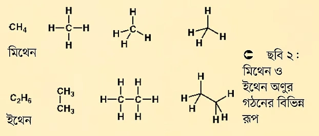 আমরা যখন মিথেন (ম্যাথেইনও বলা হয়) অণুর সংকেত লিখি, তখন শুধু CH4 লিখি। একটা কার্বন পরমাণুর সঙ্গে চারটি হাইড্রোজেন পরমাণু যুক্ত। কিন্তু এটাকে যদি আরও একটু গভীরভাবে বোঝার জন্য আঁকি, তখন আঁকা হয় নিচের ছবির মতো (ছবি ২)। এভাবে এঁকে শুধু অণুটির সংকেতই বোঝানো হয় না; বরং এর জ্যামিতিক গঠন সম্পর্কেও ধারণা দেওয়া হয়। মিথেন অণু যে চতুস্তলকীয় (Tetrahedral), সেটা বোঝানো হয়। অণুদের এই নির্দিষ্ট গঠন এদের রাসায়নিক বিক্রিয়ার অনেক কিছু নির্ধারণ করে। এখন যদি ইথেন অণুকে লিখে প্রকাশ করা হয়, তাহলে লেখা যাবে C2H6 অথবা CH3-CH3। তবে অর্গানিক কেমিস্টরা আরও স্বল্প সময়ে এঁকে প্রকাশের জন্য সেটাকে ভিন্নভাবেও প্রকাশ করেন। আসলে অর্গানিক কেমিস্টরা সময়কে অনেক গুরুত্ব দেন।
