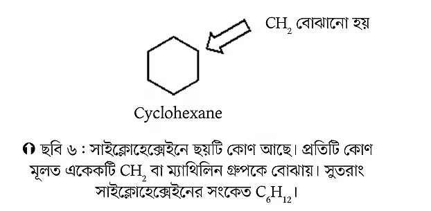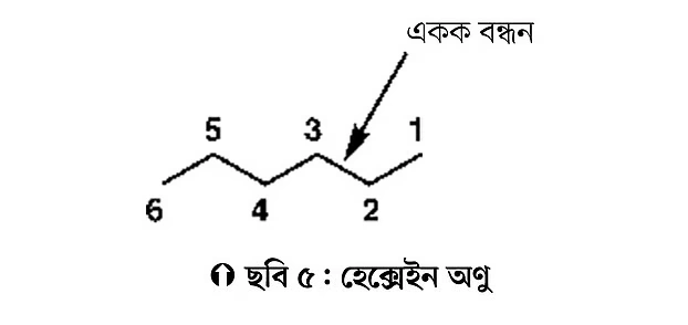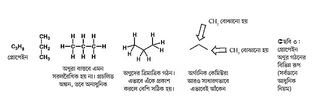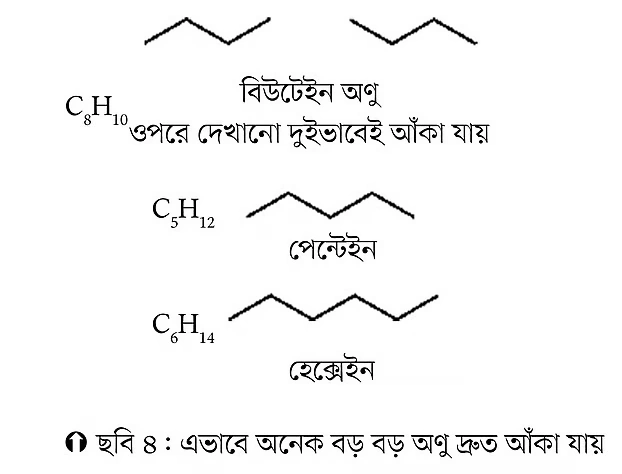 যেমন প্রোপেইন অণুতে তিনটি কার্বন পরমাণু আছে (ছবি ৩)। বিভিন্নভাবে এর রাসায়নিক গঠন প্রকাশ করা যায়। তবে আধুনিক নিয়মে, শুধু দুটি ছোট সরলরেখা যুক্ত করেই প্রোপেইন অণু বোঝানো হয়। রেখা দুটি যুক্ত করলে একটা কোণ তৈরি হয়, যেটা ১২০ ডিগ্রির মতো করে আঁকা। সে কোণের কার্বন পরমাণুটি হলো ম্যাথেলিন গ্রুপ (CH2) আর প্রান্তিক দুটি অংশ হলো ম্যাথাইল বা মিথাইল গ্রুপ (CH3)। এভাবে আঁকতে সহজ। সময় কম লাগে এবং ত্রিমাত্রিক গঠনও অনেকটা তুলে ধরা যায়। এখানে বিউটেইন, পেন্টেইন, হেক্সেইন অণুর উদাহরণ দেওয়া হলো (ছবি ৪)। শিক্ষার্থীরা এভাবে অন্য অণুগুলোও এঁকে চর্চা করতে পারো।