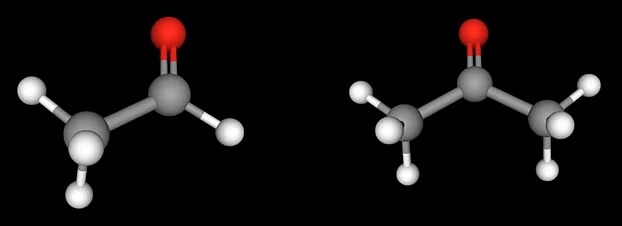 আবার তৃতীয় যৌগটি তথা অ্যাসিটোন প্রথম যৌগের তুলনায় কম শক্তিশালী ইলেকট্রোফাইল। কারণ, অ্যালডিহাইডে কার্বনিল মূলকের সঙ্গে একটি হাইড্রোজেন যুক্ত থাকে। কিটোনের বেলায় সেই হাইড্রোজেনের পরিবর্তে থাকে কার্বন। ফলে কার্বনিল মূলকের কার্বন পরমাণু অনেকটা ঢাকা বা ঘেরাও বা শিল্ডেড থাকে। অর্থাৎ স্টেরিক বেশি। নিউক্লিওফাইল সহজে অ্যাটাক করতে পারে না। নিচের ছবি থেকেও অ্যালডিহাইড এবং কিটোনের স্টেরিক পার্থক্যের কিছুটা ধারণা পাওয়া যায়।