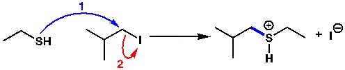 ওপরের উদাহরণ থেকে বিষয়টা বোঝা আরও সহজ হবে (পুরো বিক্রিয়া দেখানো হয়নি)। থায়োল এখানে নিউক্লিওফাইল এবং আইসো-বিউটাইল আয়োডাইড ইলেকট্রোফাইল। আঁকার সময় আমরা প্রথম তিরচিহ্ন (নীল রং) দেব নিউক্লিওফাইল থেকে ইলেকট্রোফাইলের দিকে। যেহেতু থায়োল যথারীতি এক জোড়া ইলেকট্রন দিচ্ছে, তাই আয়োডিন এক জোড়া ইলেকট্রন নিয়ে ত্যাগ করবে। কার্বন-আয়োডিন বন্ধন ভেঙে যাবে। এটা প্রতিস্থাপন বিক্রিয়া। সুতরাং দ্বিতীয় তিরচিহ্ন (লাল রং) হবে, কার্বন-আয়োডিন বন্ধন থেকে আয়োডিনের ওপর। এই তিরচিহ্নগুলো বস্তুত ইলেকট্রনপ্রবাহকে বোঝানোর জন্য। এভাবে বিক্রিয়ার ক্রিয়াকৌশল এঁকে দেখানোর প্রক্রিয়াকে বলা হয় ‘পুশ-পুল মেকানিজম’। এবং এভাবে এঁকে বোঝানো বা ব্যাখ্যা করার নিয়মই সর্বজনীন। বিজ্ঞানের সর্বজনীন ভাষা বা রীতিটা বোঝা এবং জানা থাকা গুরুত্বপূর্ণ।