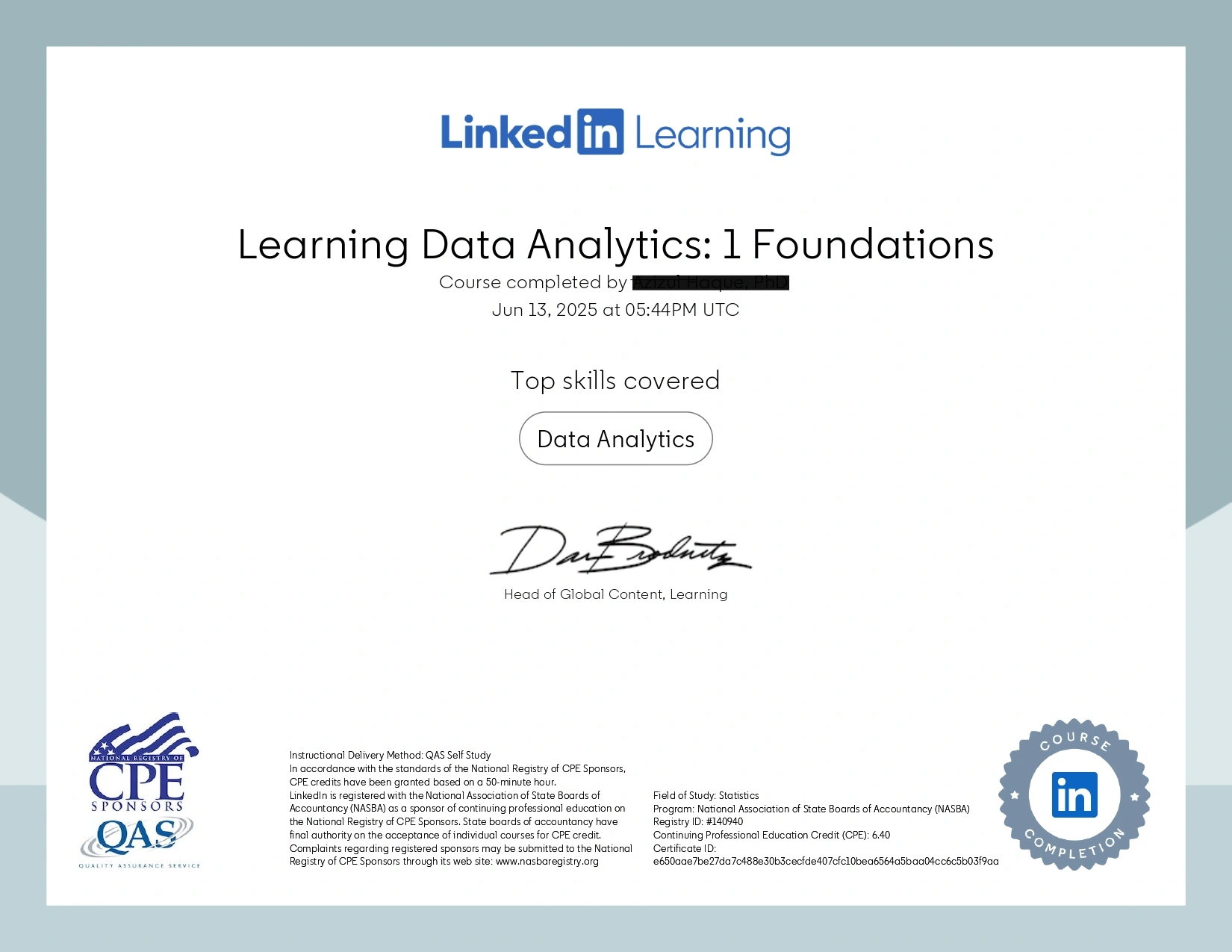 প্রতিটি অধ্যায়ে রয়েছে চ্যালেঞ্জ-ভিত্তিক অনুশীলন, যা শেখার পাশাপাশি আপনার দক্ষতা যাচাই করার সুযোগ দেবে। এই কোর্সটি National Association of State Boards of Accountancy (NASBA)-এর Professional Certificate প্রোগ্রামের অংশ এবং কোর্স শেষে ৭০% বা তার বেশি স্কোর করতে পারলে আপনি বিনামূল্যে একটি সার্টিফিকেট অর্জন করতে পারবেন। ডেটা অ্যানালাইসিসে ক্যারিয়ার শুরু করতে আগ্রহী নতুনদের জন্য এটি হতে পারে একটি আদর্শ সূচনা।