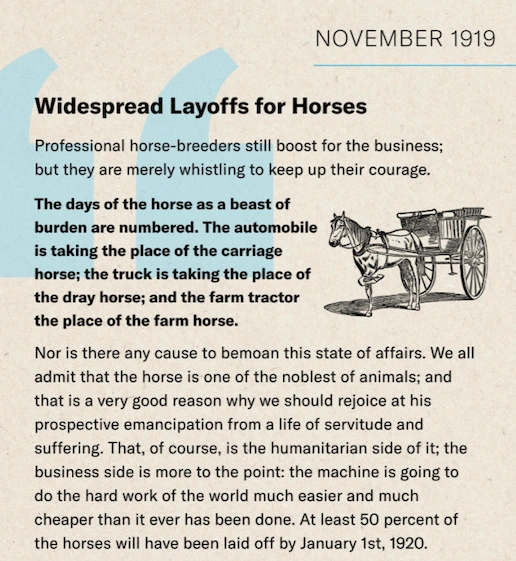 In November 1919, a prophecy appeared in the pages of Scientific American: the working life of the horse was nearing its end. At the time, horses were still the principal source of power—on city streets, farm fields, and for pulling carts. Yet, within just a few years, the arrival of motorcars, trucks, and tractors suddenly began to diminish the necessity of this “noble animal.” As the article stated, “The days of the horse are coming to an end. The car is taking the place of the carriage, trucks are replacing freight horses, and the tractor is making the farm horse obsolete.”
