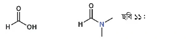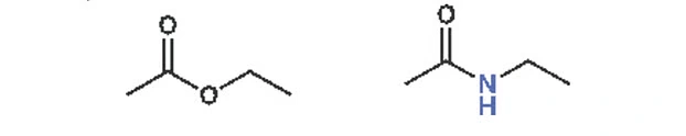 If you replace the oxygen of an ester with a nitrogen atom, you get an amide. Above, examples of both ethyl acetate and amide are shown. Just below, you can see formic acid along with dimethylformamide.