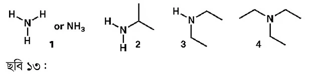Now let’s discuss functional groups containing nitrogen atoms. Although amides contain nitrogen, amides are considered derivatives of carboxylic acids. Among nitrogen or amine group-containing compounds, ammonia is the smallest. Replacing the oxygen atom in a water molecule with nitrogen gives ammonia. Conceptually, this is a way to draw analogy. Amines are alkaline compounds.