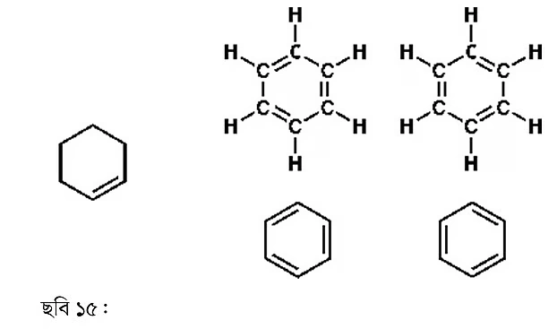 Cyclohexene is a cyclic compound, as discussed in the second part. This compound has one double bond and six carbon atoms. If a similar compound has three double bonds, it becomes benzene—a completely different type of molecule.