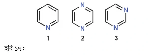 The first molecule is pyridine—an aromatic liquid, used as an organic base. The second compound is pyrazine, which has a nutty aroma but isn’t a liquid like pyridine; rather, it is solid at room temperature. The third is pyrimidine. Both the second and third compounds contain two nitrogen atoms. The drugs we take most often contain hetero-aromatic rings in their molecules.