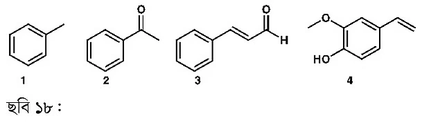 Above are examples of a few more aromatic compounds. When a methyl group is attached to the benzene ring, it’s called toluene (1). Toluene is used as a solvent. The second compound is acetophenone—a ketone group attached to benzene. This compound is found in almonds. The third compound is my favorite: cinnamaldehyde, which gives cinnamon its characteristic aroma. The last compound has a very strong odor which I do not particularly like; this is eugenol (4), responsible for the aroma of cloves. Every compound mentioned here, I’ve used in the lab. Organic chemists routinely handle countless such molecules.