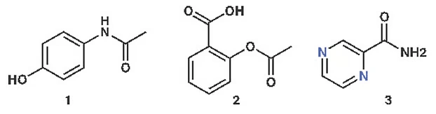 The aspirin molecule contains both carboxyl and ester groups. The last molecule is a drug used for tuberculosis. This molecule contains a pyrazine ring and an amide group.
