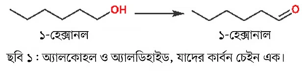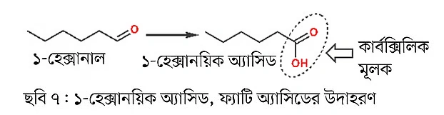For example, 1-hexanal is an aldehyde compound. If the carbonyl carbon of that compound is attached to an OH group, it becomes a carboxylic acid group—in other words, a carboxylic acid or 1-hexanoic acid. Fatty acids can also contain carbon-carbon double bonds, meaning they can be unsaturated fatty acids. The above fatty acid example is of a saturated fatty acid. The edible oils we consume contain both saturated and unsaturated fatty acids, so those oils have carbon-carbon double bonds. And the presence of double bonds means cis or trans isomers can exist. The previous part discussed this topic.