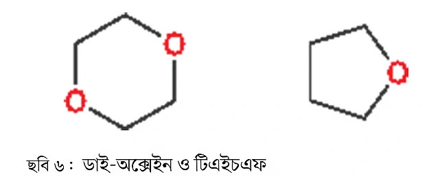 Ethers can also be cyclic. The hexagon-shaped compound above is called dioxane, and the pentagon-shaped one is tetrahydrofuran or simply THF (Image 6). Both are extensively used as solvents. In later installments, these compounds will be used as examples, so I am introducing them now.
