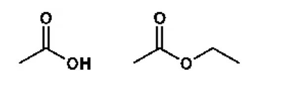 Two other important groups, esters and amides, also arise from carboxylic acids. The sweet smell of fruits is mostly due to ester compounds. For instance, the first molecule is acetic acid, the main acid in vinegar. If you replace the hydrogen of the hydroxyl group in acetic acid with an ethyl group, you get an ester—ethyl acetate. Ester compounds are also widely used as solvents.