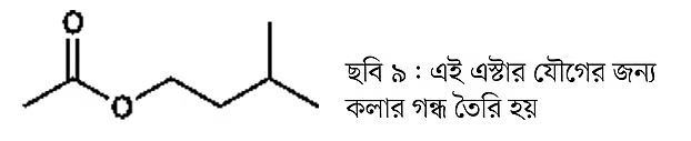 Following modern drawing methods, these compounds can now be drawn very quickly and easily. By increasing the length of the carbon chain, many compounds can be rapidly illustrated. Below is another example of an ester. In fact, by replacing the ethyl group of ethyl acetate with an isoamyl group (five carbons), you can draw this ester. The distinctive smell of bananas comes from this ester compound (Image 9).