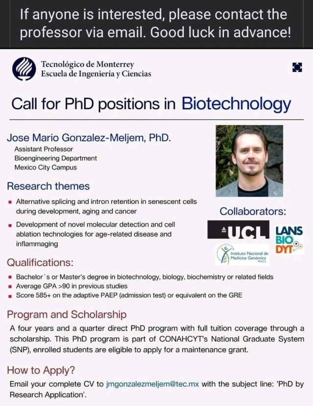 বাংলাদেশের বিজ্ঞান ও প্রযুক্তি শিক্ষার্থীদের জন্য পিএইচডি ডিগ্রি শুধুমাত্র উচ্চশিক্ষার এক ধাপ নয়, বরং এটি গবেষণার মাধ্যমে নতুন জ্ঞান সৃষ্টির একটি সোনালী সুযোগ। যারা জীববিজ্ঞান, বায়োটেকনোলজি, বায়োকেমিস্ট্রি বা সংশ্লিষ্ট বিষয়ে পড়াশোনা করেছেন, তাদের জন্য মেক্সিকোর Tecnológico de Monterrey বিশ্ববিদ্যালয়ে বায়োটেকনোলজিতে পিএইচডি করার সুযোগ রয়েছে!