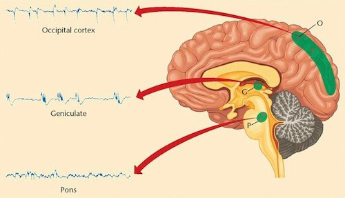 টেম্পোরাল লোবের ঠিক নীচে মস্তিষ্কের দুটি “হিপ্পোক্যাম্পাস” নামক অংশ থাকে। এই উপদশায় চোখের পাতা বন্ধ হলেও, মস্তিষ্কের ভিসুয়াল কর্টেক্স-এর কাছে অবস্থিত নিউরাল লুপটি যা দৃষ্টি সম্বন্ধীয় তথ্যের শর্ট টার্ম মেমোরি হিসাবে কাজ করে, হিপ্পোক্যাম্পাসে লং টার্ম মেমোরি-র জন্য উপযুক্ত ভিসুয়াল ডেটা পাঠাতে শুরু করে ও তাই নিউরাল লুপটির নিউরোন বা স্নায়ুকোষগুলি সক্রিয় থাকায় তা প্রায়শই চোখের টনিক পেশীকে (টনিক মাসল্) কম হারে কিন্তু অনেক সময় ধরে উদ্দীপিত (স্টিমুলেট্) করে যার ফলে চোখের এক ধীর গতির চলন (মুভমেন্ট) লক্ষ করা যায়। সতর্ক জাগ্রত অবস্থা থেকে নন্ রাপিড আই মুভমেন্ট ফেজ এর এই প্রথম উপদশায় উপনীত হলে, শর্ট টার্ম মেমোরি থেকে আসা ভিসুয়াল ডেটা গ্রহণ করে হিপ্পোক্যাম্পাস উদ্দীপিত হয় ও উচ্চতর (হায়ার) কম্পাঙ্কের থিটা তরঙ্গ বা হিপ্পোক্যাম্পাল থিটা তরঙ্গ নির্গত করতে শুরু করে যা মস্তিষ্কে মানুষটির নিজের বর্তমান অবস্থান (কারেন্ট স্পেশিয়াল লোকেশন) এর ধারণা রাখতে সাহায্য করে।