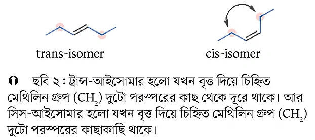ট্রান্স–আইসোমার হলো যখন দ্বিবন্ধনের সবচেয়ে কাছের কার্বন পরমাণু দুটি (গোলাপি রঙের বল দিয়ে চিহ্নিত) একে অন্যের কাছ থেকে দূরে থাকে। আর সিস আইসোমার হলো যখন সেই দুটি কার্বন পরমাণু একে অন্যের কাছাকাছি সরে আসে। একটু প্র্যাকটিস করলেই দ্রুত এই আইসোমারগুলো আঁকা যাবে।