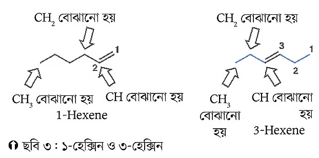 হেক্সিন যৌগকে আমরা যদি ছবি ১-এর মতো আঁকি, তাহলে অনেক সময় প্রয়োজন। এ ছাড়া যৌগে যদি দ্বিবন্ধন থাকে, তাহলে দুটি আইসোমার বা সমাণু থাকে। একটা হলো ট্রান্স–আইসোমার, অন্যটা সিস–আইসোমার। ট্রান্স ও সিস–আইসোমারকে জ্যামিতিক সমাণুতা বা জিওম্যাট্রিক আইসোমারিজম বলা হয়। পুরোনো নিয়মে অণু বা যৌগের এই সমাণুতা আঁকতে গেলেও পরিষ্কারভাবে প্রকাশ করা যায় না। অন্যদিকে যদি নিচের চিত্রের (ছবি ২) মতো আধুনিক নিয়মে আঁকা হয়, তাহলে বোধগম্য হয় সহজে। এ ছাড়া সারা পৃথিবীতে এখন অর্গানিক কেমিস্ট বা জৈব রসায়নবিদেরা এভাবেই আঁকেন। ফলে যত নামকরা জার্নাল বা বিখ্যাত বই আছে, সর্বত্র এই আধুনিক নিয়মের অঙ্কন অনুসরণ করা হয়।