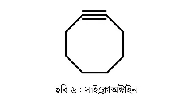 অ্যালকাইন যৌগ চক্রিক বা সাইক্লিক হতে পারে। যেমন সাইক্লোঅক্টাইন একটা জনপ্রিয় উদাহরণ (ছবি ৬)। এই যৌগে আটটি কার্বন পরমাণু আছে।