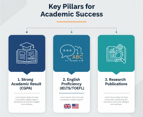 After deciding why you want to study, what are the prerequisites for higher education abroad? Dr. Mashiur repeatedly emphasized three fundamental pillars upon which your preparation must stand. He said, “For higher education, these three things are extremely important.” He put special stress on fulfilling these three conditions—