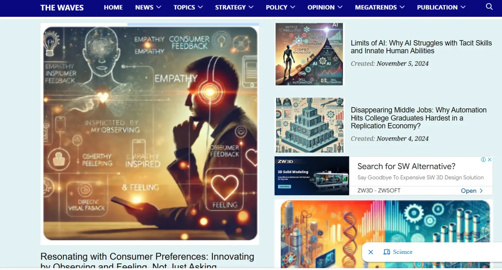 ২০২৪ সনের একটি পরিসংখ্যানে দেখা যায় বাংলাদেশের জনগণের প্রায় ৪৫% জনগণ মোবাইল ফোন কিংবা কম্পিউটারের মাধ্যমে ইন্টারনেট ব্যবহার করে। এই বিশাল ইন্টারনেট ব্যবহারকারীরা মূলত পত্রিকার ওয়েবসাইট, ফেসবুক সহ অন্যান্য সোশ্যাল মিডিয়া এর ব্যবহারকারী। এছাড়া কিছু ব্যবহারকারী ইকমার্স এবং হাতে গোনা কিছু ব্লগ এর সাইট পড়েন। এইগুলির বাহিরে বিজ্ঞান ও প্রযুক্তি সংক্রান্ত ওয়েবসাইট এর সংখ্যা খুবই নগণ্য। কিন্তু বাংলাদেশির হাতে তৈরি, খোদ ঢাকাতে বসে বিশ্ব দরবারে আন্তর্জাতিক প্রযুক্তির পলিসি ও দিকনির্দেশনা নিয়ে লিখছে এমন কেউই নেই- আমার সেটিই ধারণা ছিল। কিন্তু সেই ভুলটা ভাঙলো “দ্যা ওয়েভস” https://www.the-waves.org/ নামক একটি চমৎকার পোর্টাল দেখে। আজকে আপনাদেরকে সেই সাইটেরই গল্প শোনাব। এটি অনলাইন এনালাইসিস এবং কমেন্টানি বা মতামত পাবলিকেশন এর ওয়েবসাইট। এটি শুধু একটি ওয়েবসাইট বললে ভুল হবে, আবার অনলাইন ম্যাগাজিন বললেও যথার্থ হবে না—তাই একে ‘পোর্টাল’ বলেই সম্বোধন করছি।